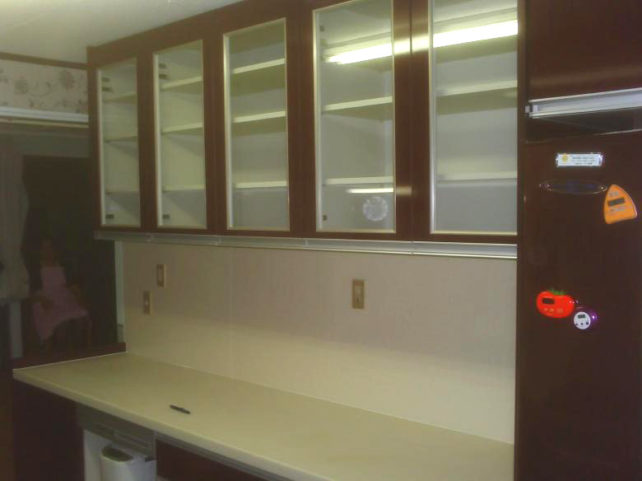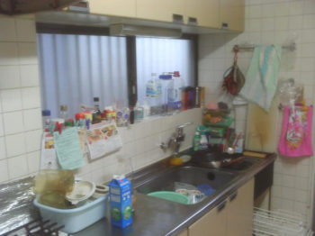 施工前のキッチンの様子です。古くなり、収納も足りないと感じていました。 また物があふれてしまっているのもお悩みでした。こちらをすっきりとまとまったシンプルなキッチンにリフォームしていきます。