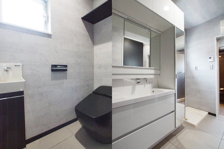 洗面台は収納が多く手入れも簡単なものを設置させていただきました。洗面スペースも従来のものよりも広いです。