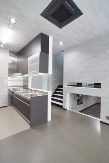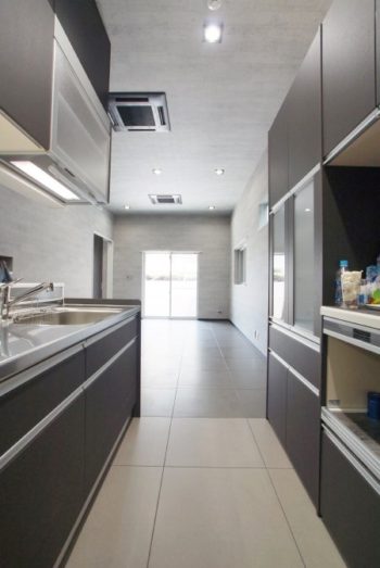 キッチンからリビングを見渡せるようになっています。天井が高く作られているので、一層空間は広く感じられます。